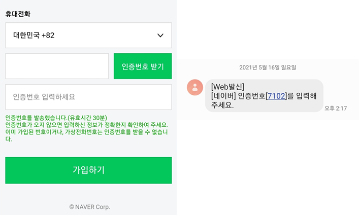 - 인증방식 : 인증번호 입력