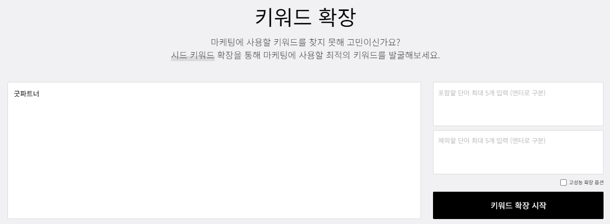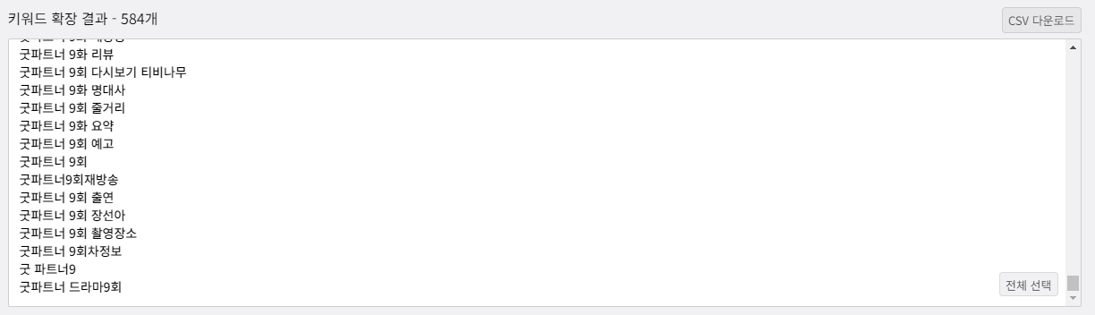 키워드를 입력하면 '키워드 확장 시작' 버튼을 누르면 아래와 같이 키워드 확장 결과를 확인할 수 있습니다.